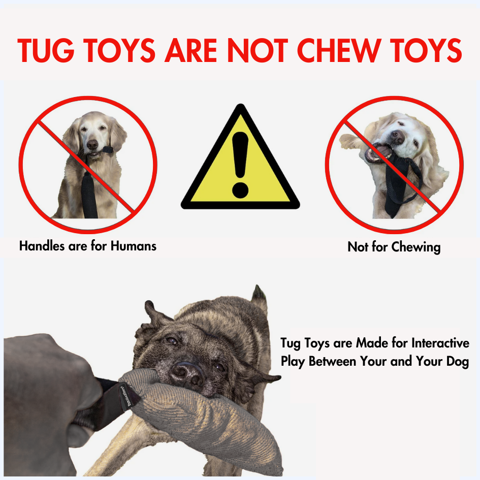 - IT’S NOT A CHEW TOY: Tug Toys are meant for interactive tugging between you and your dog only, not chew toys. Please note that the handles on the tugs are not designed for the dog to bite but are for handler use only. Always supervise.